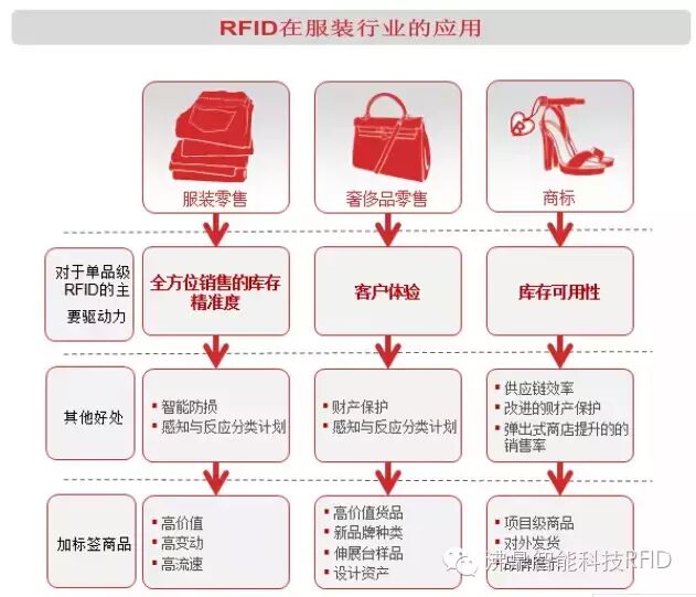 服装行业是首先引入RFID技术的行业,虽然引入时间不长,但是它却以其极具竞争力的优势,迅速遍布了欧美的众多品牌服饰零售商,如Mark & Spencer,Levi's,Throttleman,American Apparel,Le Coq Sportif,Karstadt,,Dillards等大型的服饰制造零售商都采用RFID技术来改善其供应链系统和零售窗口。 由于服装类产品是一种时尚产品,销售季节、销售的地点、消费者的品味档次、流行趋势、产品的价位等许多因素都有会影响到产品的销量。因此,对销售状况进行实时跟踪,对服装业企业是非常重要的管理内容,而采用RFID技术能够在多方面提升企业的效率。 销售统计 使用RFID服装吊牌,对于快速的销售统计有深远的意义。每一个RFID标签都是独立的个体,大容量的存储空间允许用户存储款式,颜色,尺码,销售地等多种用户信息,通过快捷的RFID识别,销售部门能够以最快的速度得到准确的统计结果,从而能够帮助销售部门及时配货补货,并制定科学的市场策略。 柜台销售自动化 使用电子标签可以实现专卖柜中的便携式POS机的功能,并可完成销售、退货、柜台存货、盘点、收款等销售自动化作业的功能;同时可以生成各种当日统计报表,传送给总部或当地办事处进行销售分析。 退货跟踪 在市场竟争中,各厂商都在提高服务质量,都允许客户退货。通过退货统计分析,可以准确找出产品质量问题,追究责任部门、责任单位和责任人。 柜台盘点和找货 柜台盘点和找货对于各个专卖柜来说,是一项非常繁琐、容易出错的工作。使用手持式读写器或数据采集器可以非常容易的实现柜台盘点和找货,提高工作效率,不会产生任何盘点差错(尤其是使用单体唯一编码方式以后),盘点结果可以迅速送给上级单位。 RFID智能电子服装吊牌就是品牌服装的“身份证”,每件服装都有了唯一码的服装吊牌就好比每个人都有身份证一样,人有了身份证就便于管理,服装有了RFID智能电子服装吊牌同样有了自动化多环节的物件管理。随着RFID智能电子标签国内技术的不断发展,RFID智能电子标签应用得到不断地推广,生产电子标签的成本不断降低,RFID智能电子标签也在各行业迅猛发展。 RFID技术的使用给服装业带来了这么多的优势,那么究竟该如何部署呢?下面一图来为你解答: